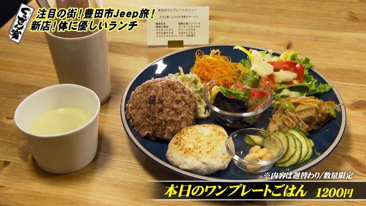 ぐっさんがいただくのは『本日のワンプレートごはん』(1200 円)。内容は週替わりで野菜をふんだんに使い、健康を気遣った体に優しいおかずが一皿に何品も盛られています。