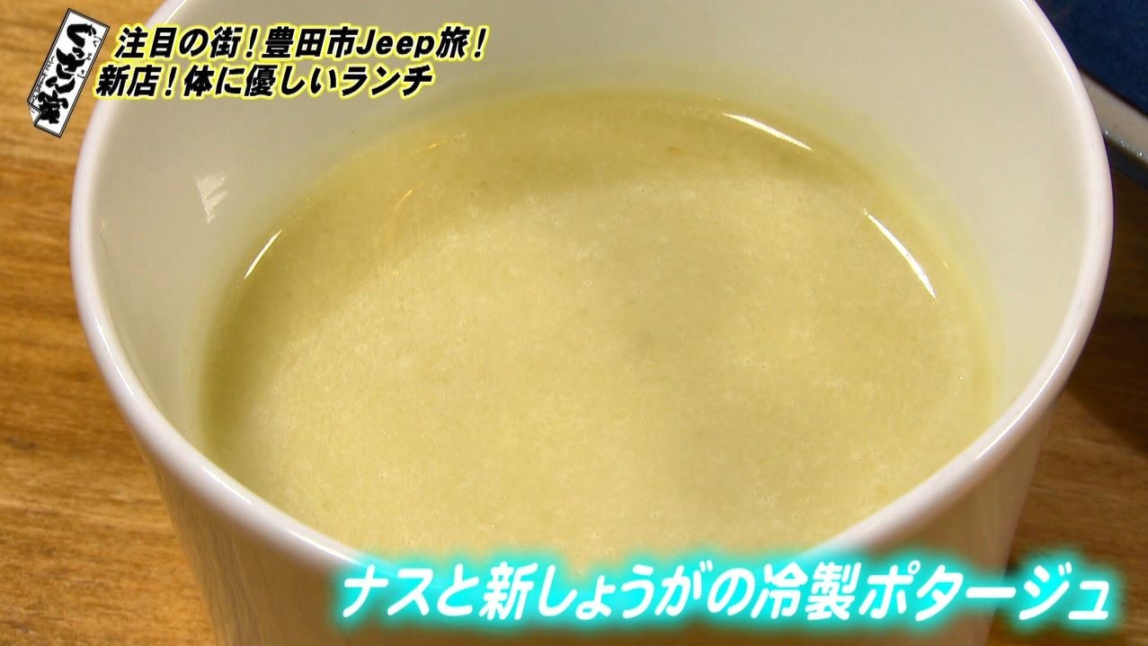 まずは暑い時季にピッタリの『ナスと新しょうがの冷製ポタージュ』をひと口…。「すっごい爽やかなおいしいスープこれ!本当にひと口、ひと口、体にいいって感じがしますよね。どんどん体に浸透していきます。ショウガが効いてるから、めっちゃおいしい」と絶賛!