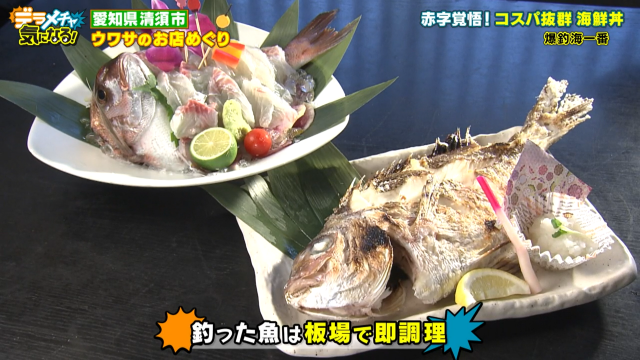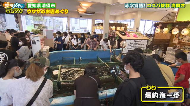 このお店は釣り堀兼食事処『爆釣海一番』。生け簀の魚を釣り、釣った魚をそのまま調理してすぐ食べられるお店なんだそうです。水槽には三重県の南勢から仕入れたアジや超大物のヒラマサも!運が良ければ600円で高級魚が釣れると大人気のお店です。