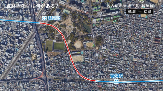 突然トンネルの形が丸くなった理由は、鶴舞駅~荒畑駅間の線路が通っている場所の“地上”にありました。