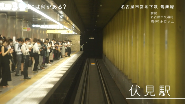 鶴舞線のトンネルの中を走行する回送列車。丸の内駅を出発して間もなく見えてきたのが伏見駅にはホームにはたくさんの人が並んでいます。これから家に帰る方々ですね。皆さん、お疲れ様です。