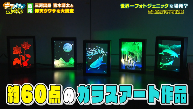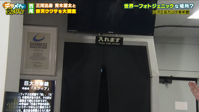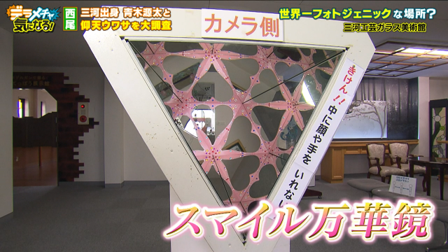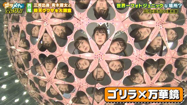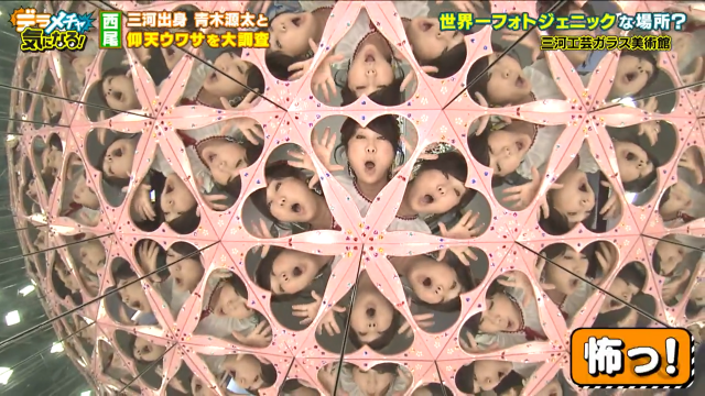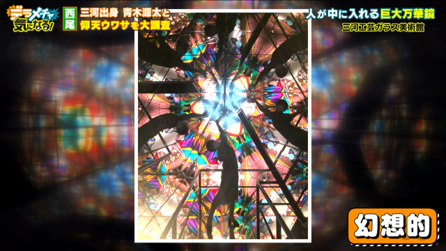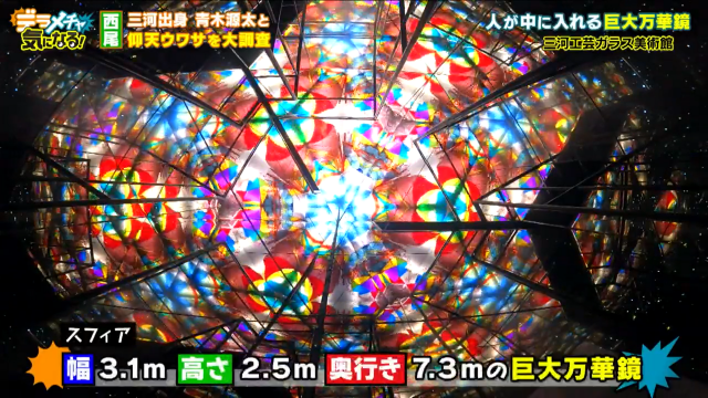「美しい柄に包まれてみたい」との想いを込めて神谷館長が作ったと巨大万華鏡『スフィア』。3基のステンドグラスが54枚の鏡に反射して模様を映し出す幻想的な空間は見るものを虜にします。青木も「世界一フォトジェニックな場所が西尾にあった!」と拍手を送っていました。