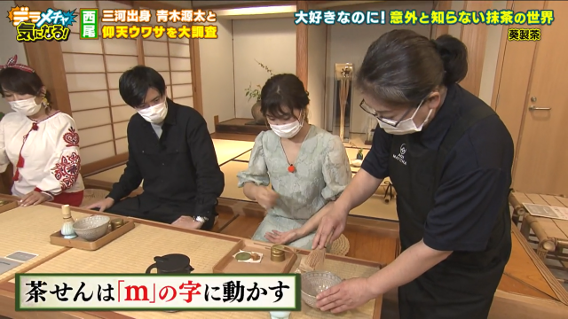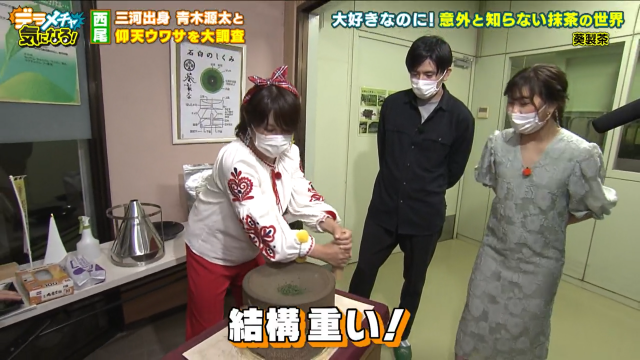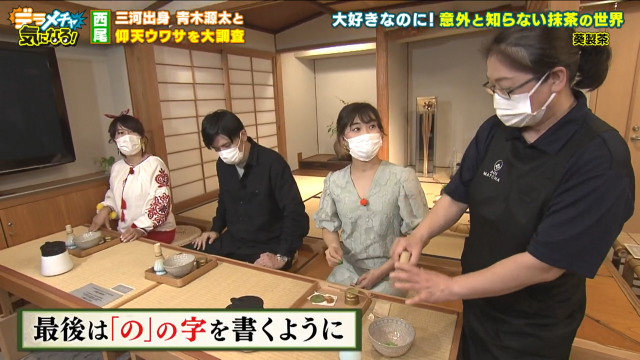 掘れば掘るほど面白い西尾市。でも、やはり定番もちゃんと抑えておきたいですよね。西尾と言えば『抹茶の街』。街の中には至る所に抹茶を楽しめるスポットがあります。そんな抹茶について詳しく知るべく、三人は大正時代から続く老舗抹茶メーカー『葵製茶』を訪れました。