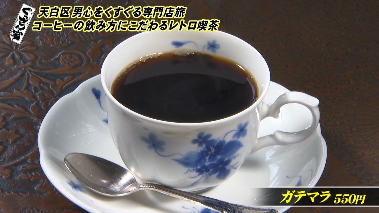 ぐっさんが注文したのは本日のおすすめのストレートコーヒー『ガテマラ』(550円)。「爽やかな苦味で。軽やかな感じでいいですね。おいしい」と至福の表情。