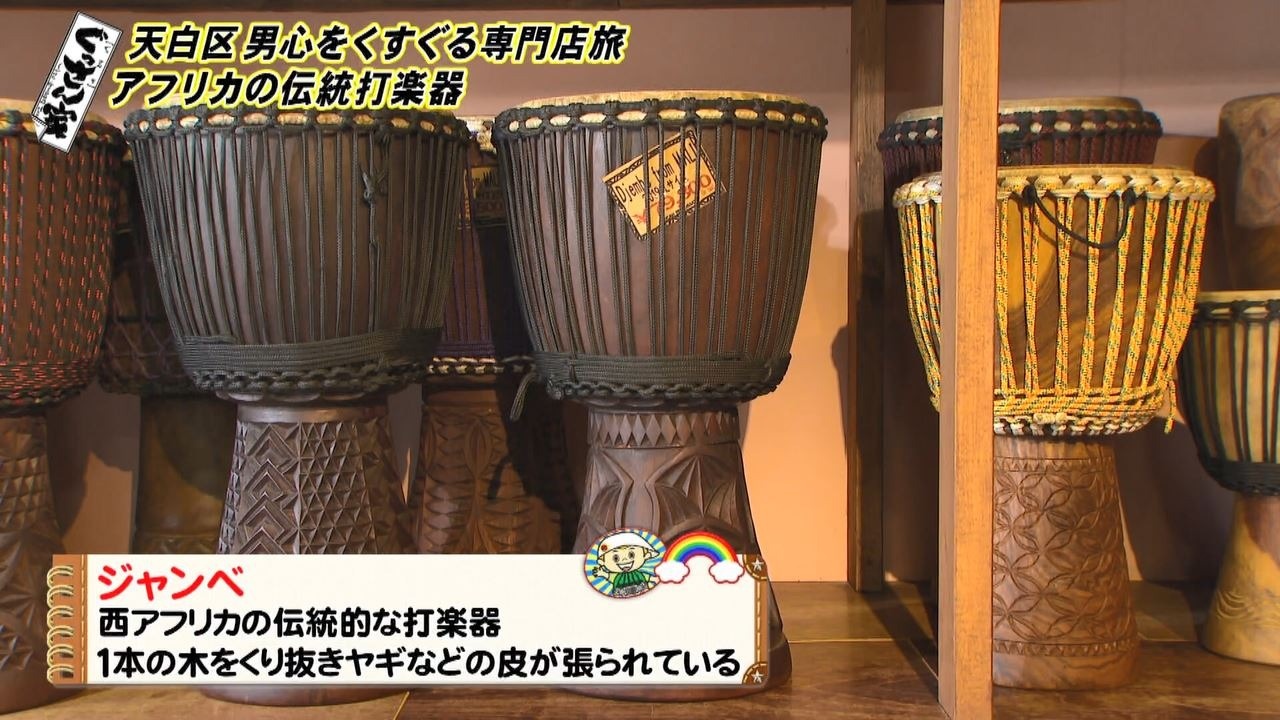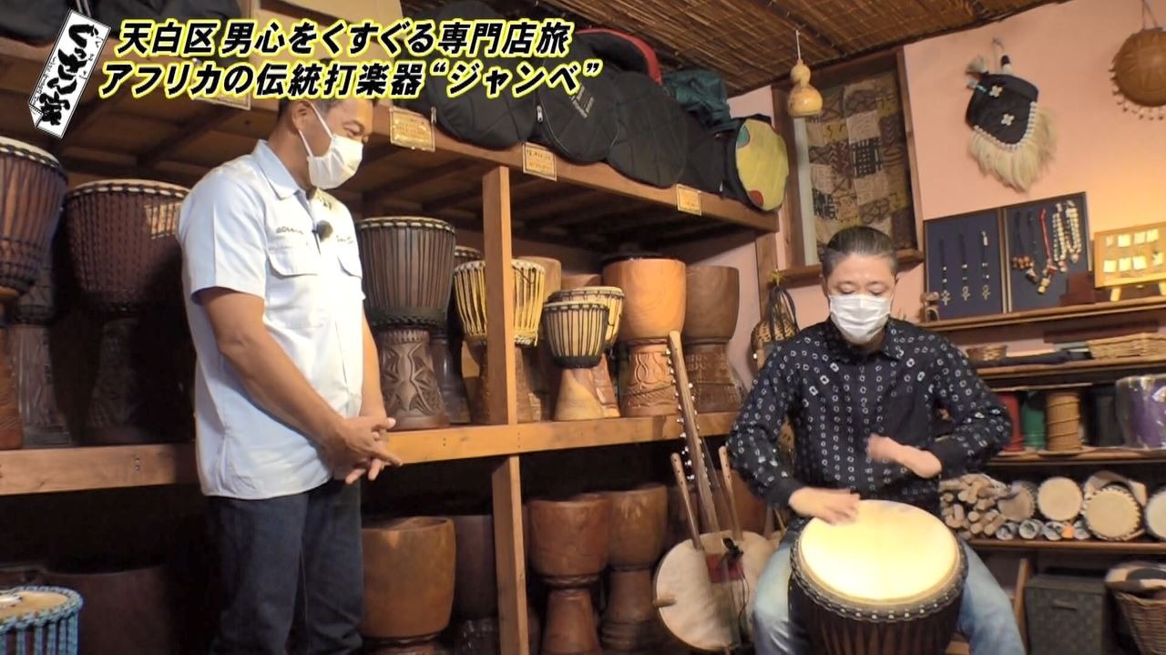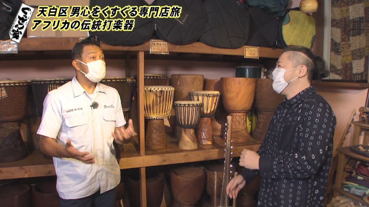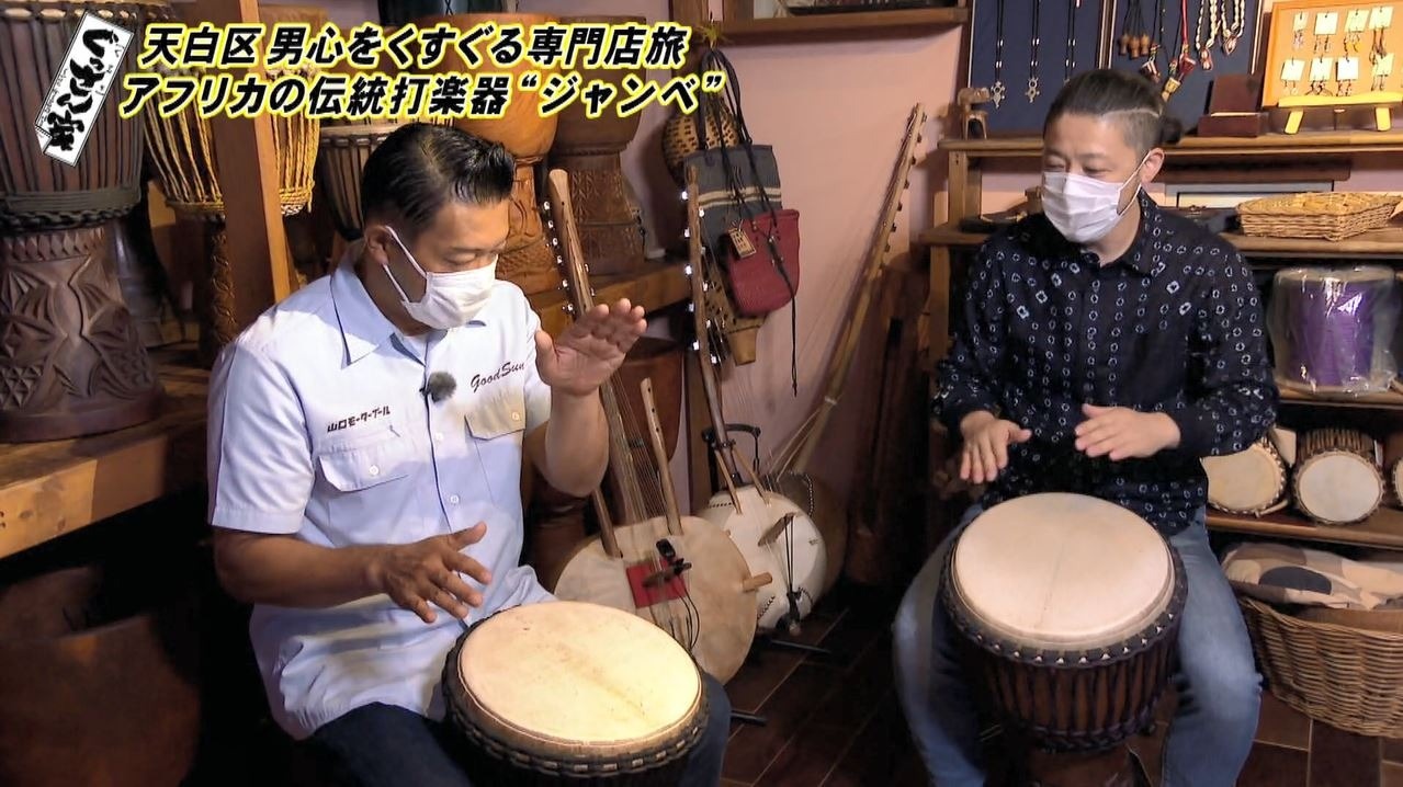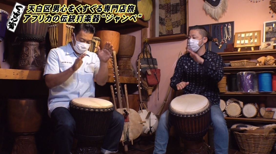 「いいじゃないですか!この雰囲気。個人的にはすごい興味ある」とお店へ入ったぐっさん。店内には西アフリカの伝統的な打楽器『ジャンベ』がズラリ!店主の野口さんは本場アフリカで修業し、ジャンベの販売や修理をしながら、レッスン講師やライブ出演もこなすジャンベ演奏家です。