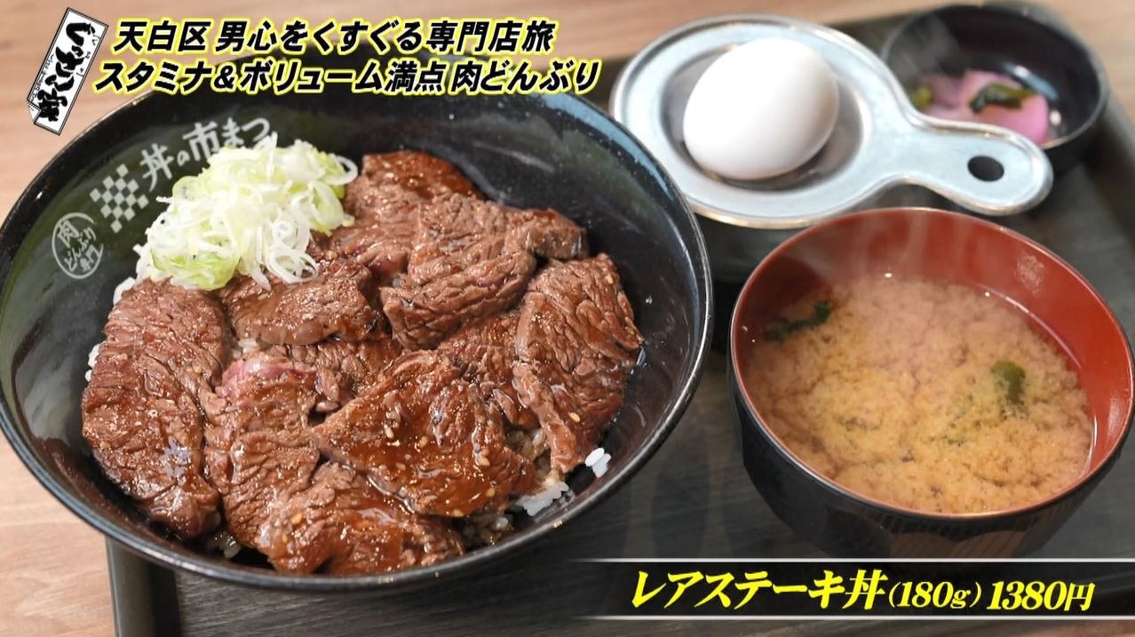 ぐっさんが注文したのは『レアステーキ丼』(180g・1380円)。ぐっさんが大好きなハラミをレアに焼き上げ、特製ダレに絡めています。脂が少なくヘルシーでやわらかいハラミがたっぷり味わえ、肉好きにはたまらない一品です。