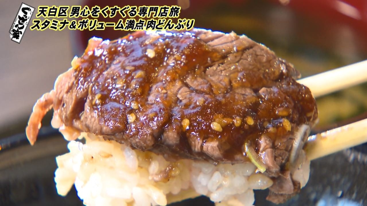 やってきたのは『丼の市まつ』。地元のステーキ店が手がける肉どんぶり専門店で、スタミナ満点!ボリュームも満点!の肉どんぶりがお値打ちに味わえるとあって、男子学生からサラリーマンまで幅広い層に人気です。