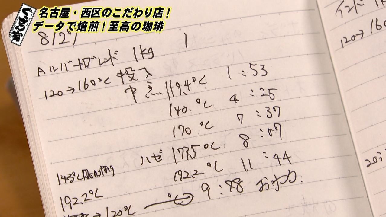 データにこだわる事で扱う人や環境に左右されず、常に最もおいしい状態にコーヒー豆を焼き上げることができます。日々の焙煎データを書き込んだノートには様々な数値がびっしり!全国のコーヒー通が注目するお店です。