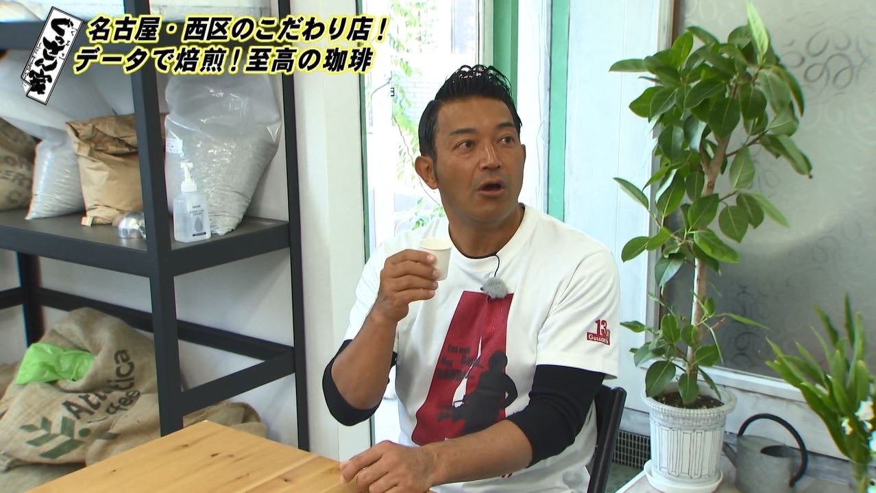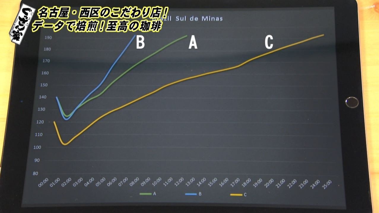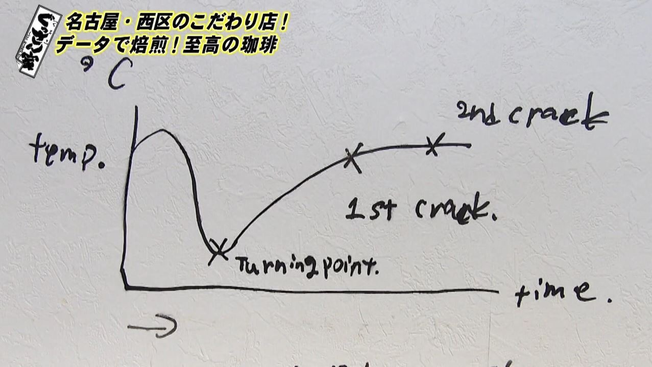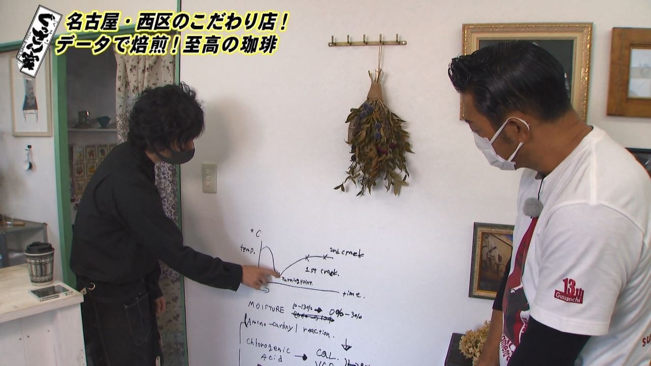 ここで壁に書かれたグラフのようなものを見つけたぐっさん。「これどういうこと?」と聞いてみると…「これ焙煎理論なんですよ。これの角度によって味が変わる。なので、この角度をどのスピードで上げていくか…というのを普段からやっています」とのこと。「俺5時間目やったら寝とったで。プールの後やったら完全に寝とった」と高度すぎる説明に苦笑いするぐっさん。