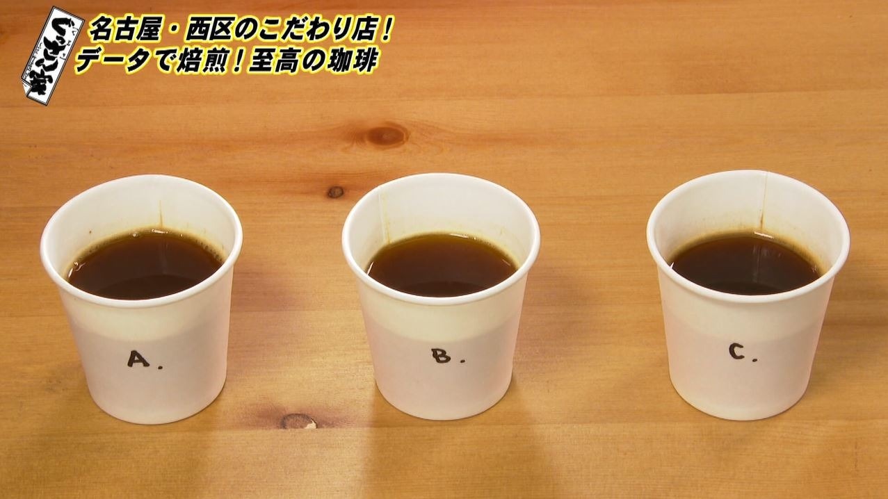 コーヒー豆の焙煎は焼きあがるまでの温度と時間で味が大きく変わるそうで、その違いを実際に感じてもらおうと同じ豆を使って焙煎のパターンを変えたA、B、Cの3種類のコーヒーを用意。