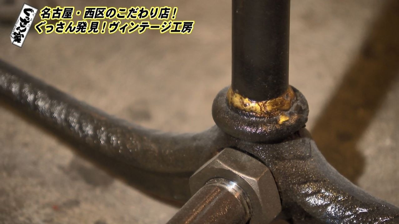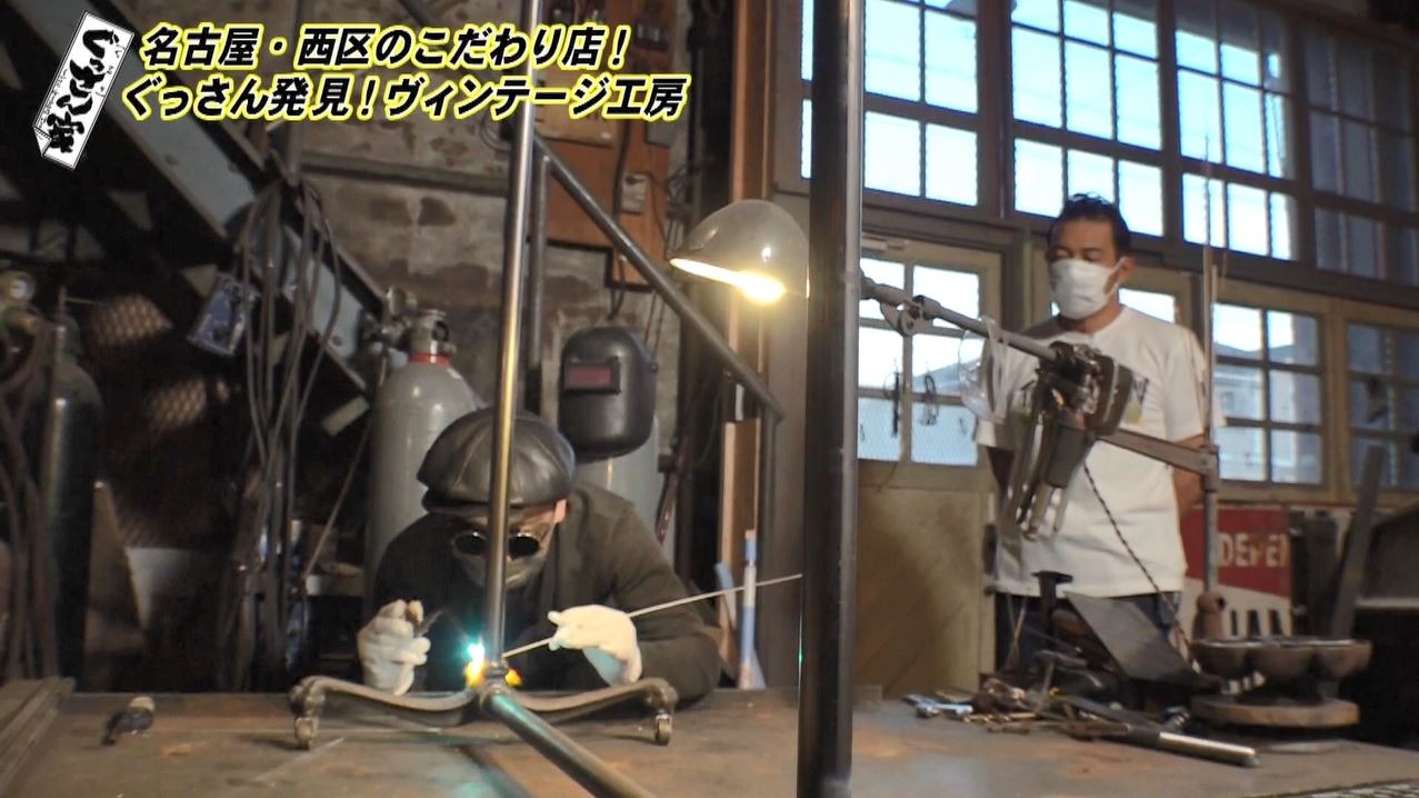 まずは工房の作業風景を見学させていただきます。作っていたのは鋳物のハンガーラック。真鍮をバーナーで溶接した脚の部分は手作業ならではの武骨さが味となり、かっこいい仕上がりに!ぐっさんも興味津々で作業に見入ります。