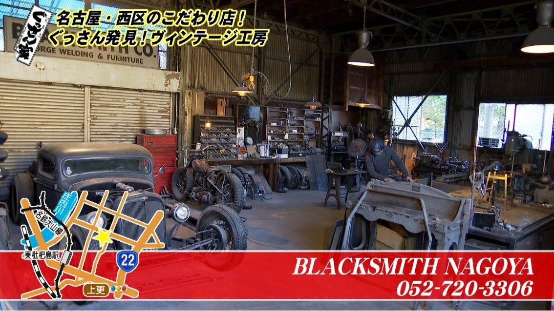 続いてお邪魔したのは『BLACKSMITH NAGOYA』。【ヴィンテージにこだわる】鉄製品の工房です。店名の『BLACKSMITH』とは英語で“鍛冶屋さん”を意味する言葉。オーナーの滝川さんが大好きな1920年代のアメリカの鍛冶屋さんをコンセプトにオリジナルの家具やインテリア小物を作っています。
