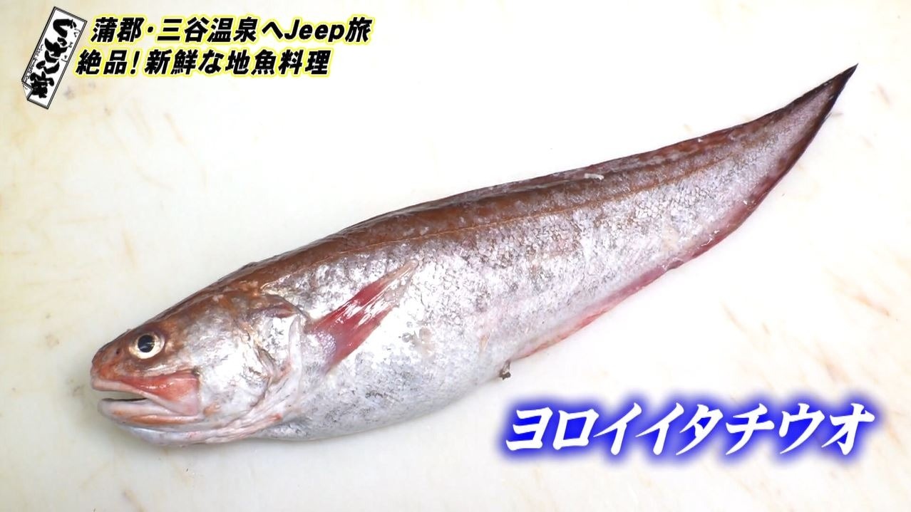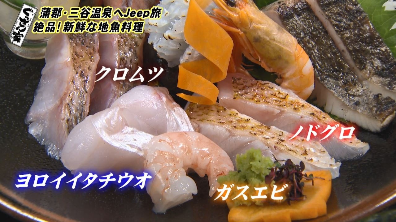 続いて秋から春にかけて旬を迎える深海魚のヨロイイタチウオ。淡泊で上品な味わいが特徴で、新鮮な刺身がいただけるのは漁港に近い店ならでは。「ヨロイイタチウオうまい!歯ごたえもあるんですよ、ちゃんと。ザクザクとした歯ごたえで。深海魚ってぶよんとしたイメージあると思ったら全然。ヨロイイタチウオ大ヒット!」と美味しさに唸るぐっさん。
