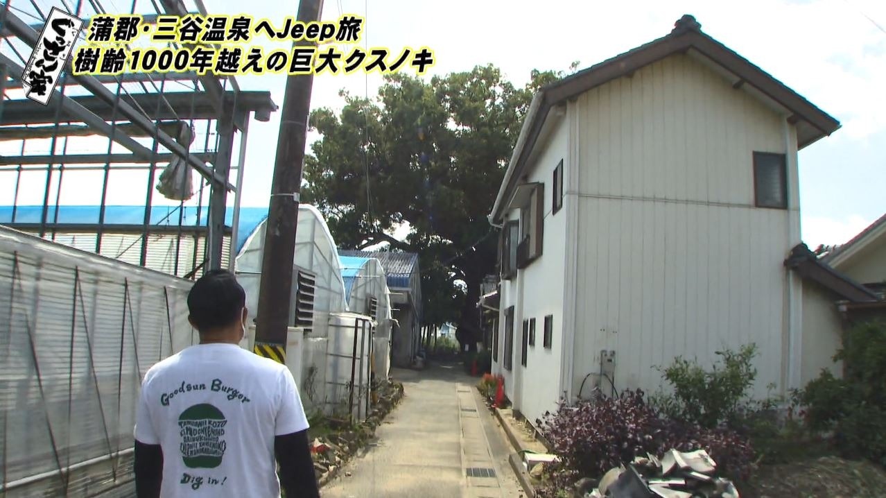 続いてスタッフから「蒲郡市には愛知県でも有数の巨大な楠がありまして…」という情報を聞いたぐっさん。「巨木ファンにはたまらないですね!」と目を輝かせます。巨木が大好きなぐっさん、これまでに番組でも沢山の巨木に出会ってきました。少し手前からでも存在感が違う巨木に「うわー!キター」とテンションが上がります。