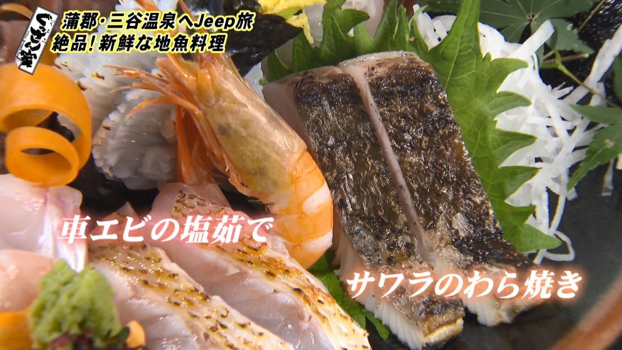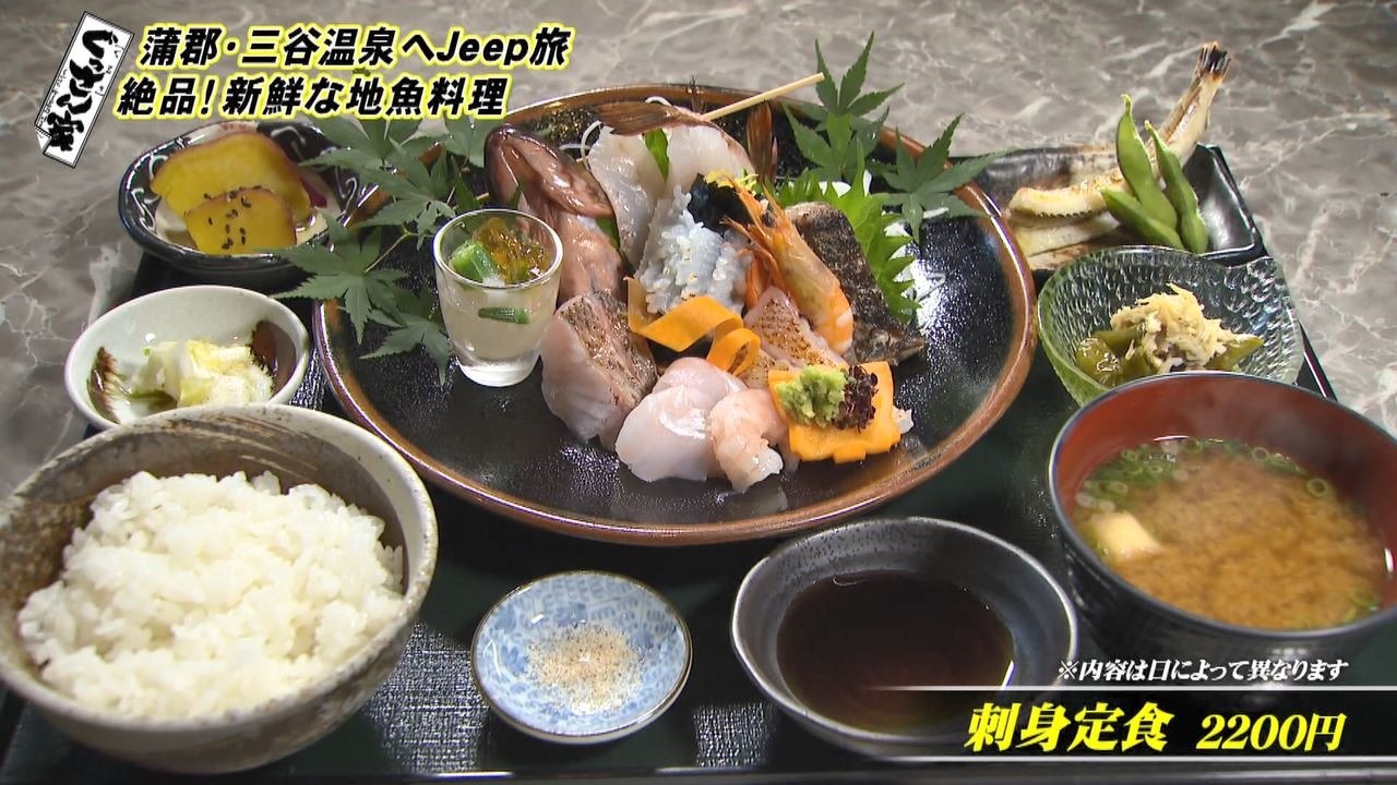 ぐっさんが注文したのは『刺身定食』(2200円)。カサゴにサワラのわら焼き、車エビの塩茹でなど盛りだくさん!