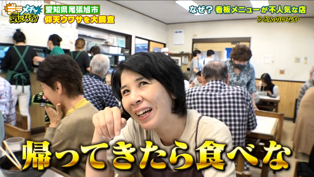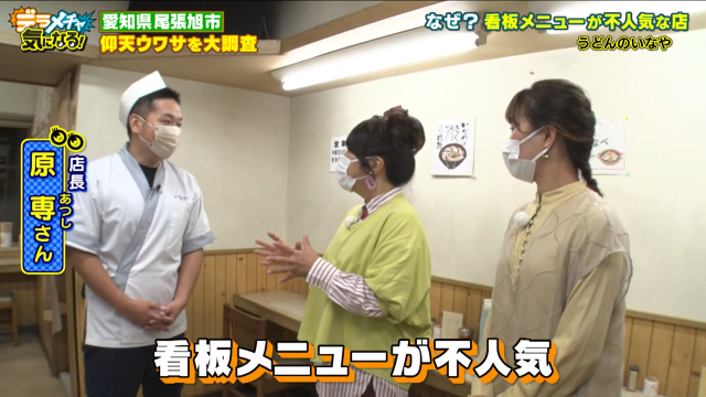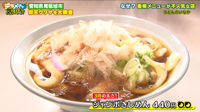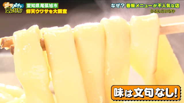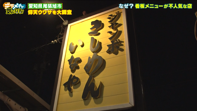続いて二人が検証するのは「看板メニューがイマイチ不人気な店があるらしい」というウワサ。お店に到着してみると、黄色の大きな看板に「ジャンボきしめん いなや」と書かれています。
